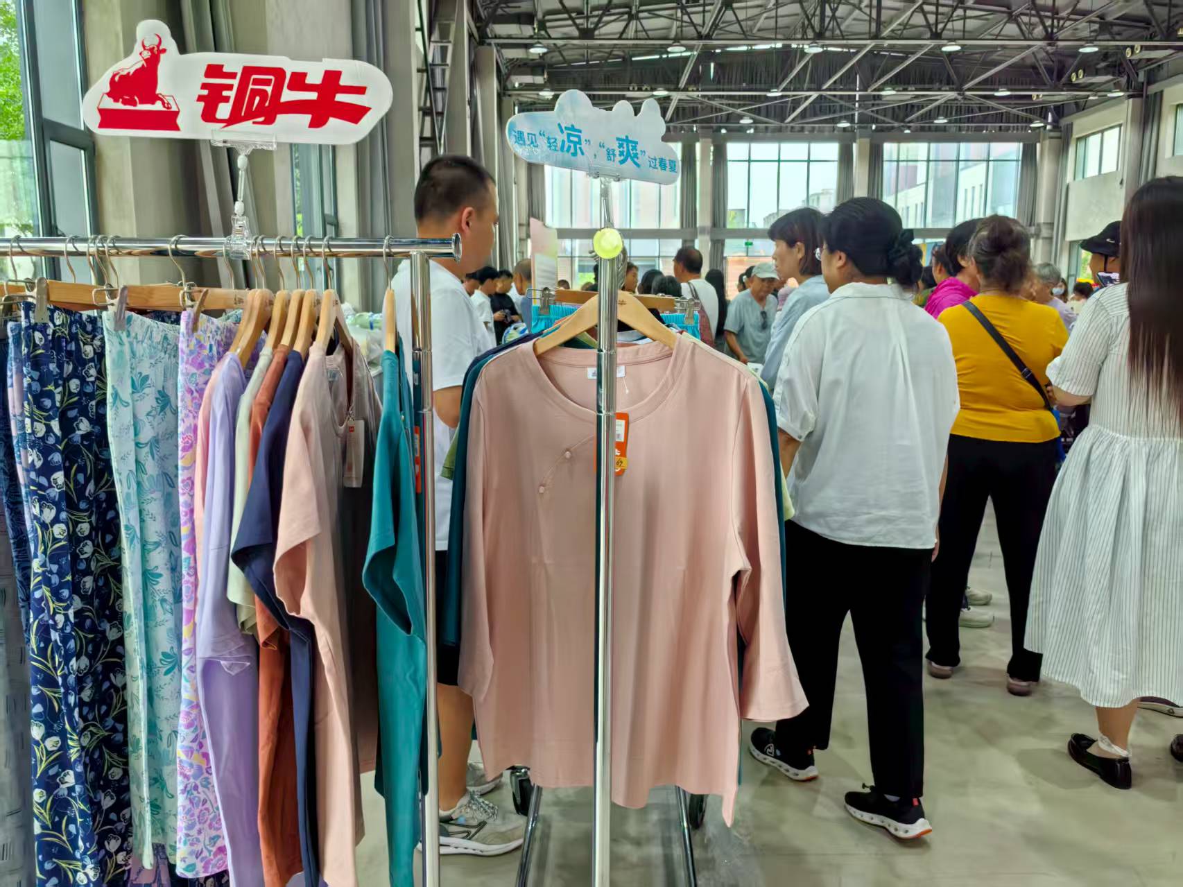 午間,金隅智造工場科技秀場內人流涌動。銅牛品牌將兼具匠心質感與前沿設計的精選產品回饋大眾。現場展售的親舒凈爽棉系列產品,具有高效抗菌功效,符合航天級標準,為園區科技工作者和社區居民帶來高品質家居穿著新選擇?,F場消費者紛紛駐足,親手觸摸感受面料的神奇質感,驚嘆于老字號產品的煥新力。